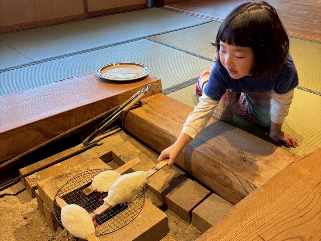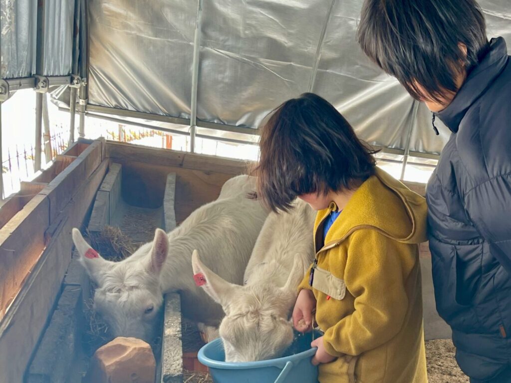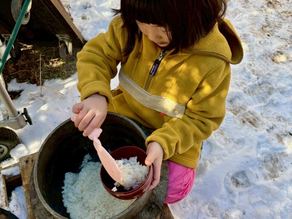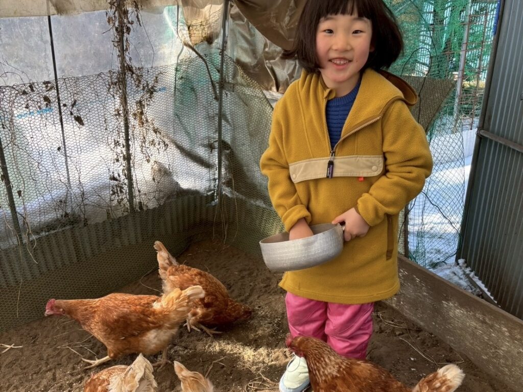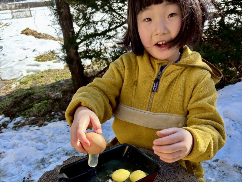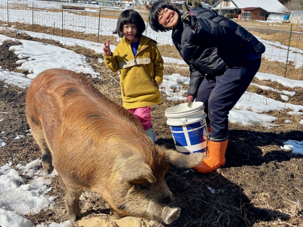 最終日は、村内で自給自足に挑みながら農業や家畜への餌やり体験を提供している玉川農園のあやさんと南信州の郷土料理「えごまだれの五平餅づくり」に挑戦!。その後ココちゃんは玉川農園へ。放牧豚やヤギ、鶏へ餌やりをしたり、うみたての卵を収穫したり、大きな放牧豚が甘えてくる迫力に驚いたりするなど、命の温もりに直接触れる貴重な時間となりました。とったばかりの卵で作ったスクランブルエッグを前に、ココちゃんから「鶏がこのスクランブルエッグ食べたらどうなるの?」の質問が!物怖じせずに聞いてくる姿に、成長を感じた瞬間でした。動物たちへの餌やりを終えた後の昼ごはんは、あやさんと一緒に火をおこし、かまどで炊いたご飯をいただき、まさに命と食の原点に触れる、豊かな経験となりました。