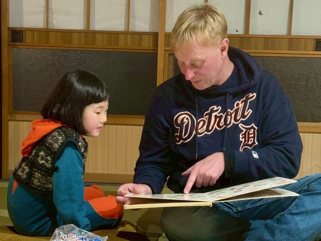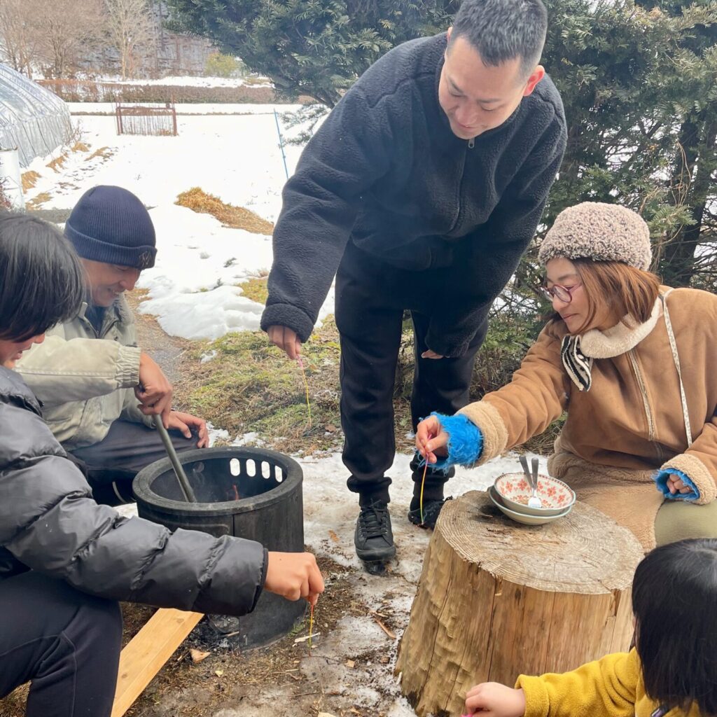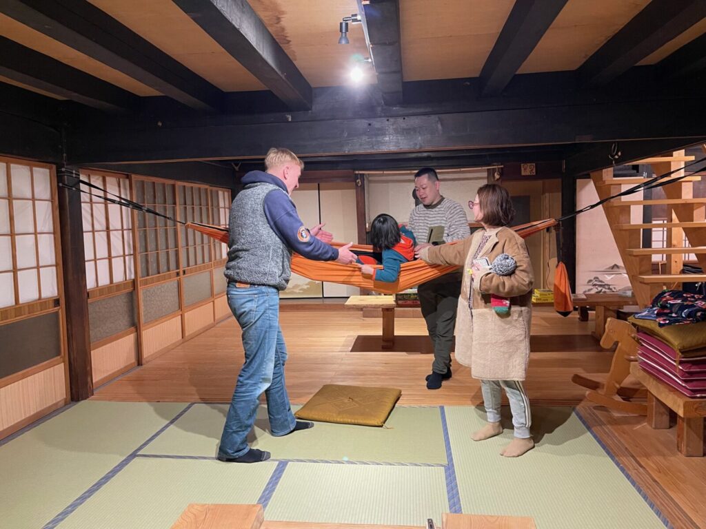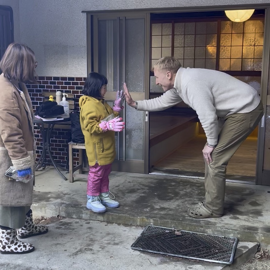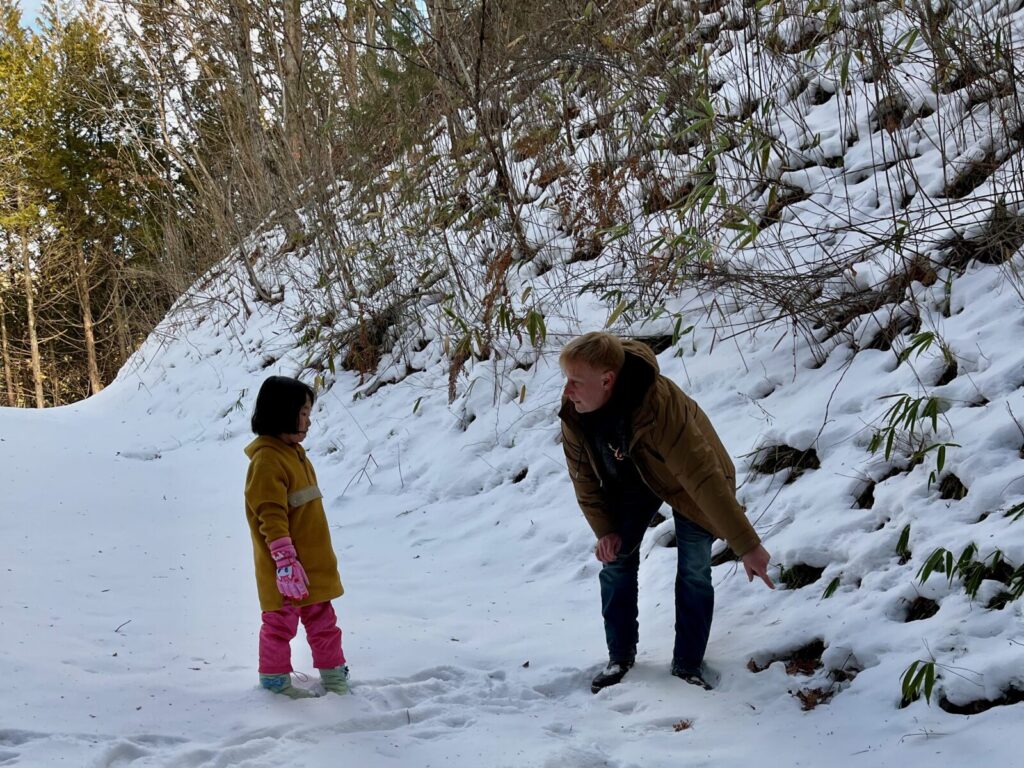 Alexさんの子どもに寄り添う姿勢は、あっという間にお子様の心を掴みます。到着直後のこたつでの団らん後には、普段は親元を離れないというココちゃんが「パパいいよ、来なくて、私一人でAlexと遊ぶ!」と早速外へ飛び出していき、ご両親を驚かせました。