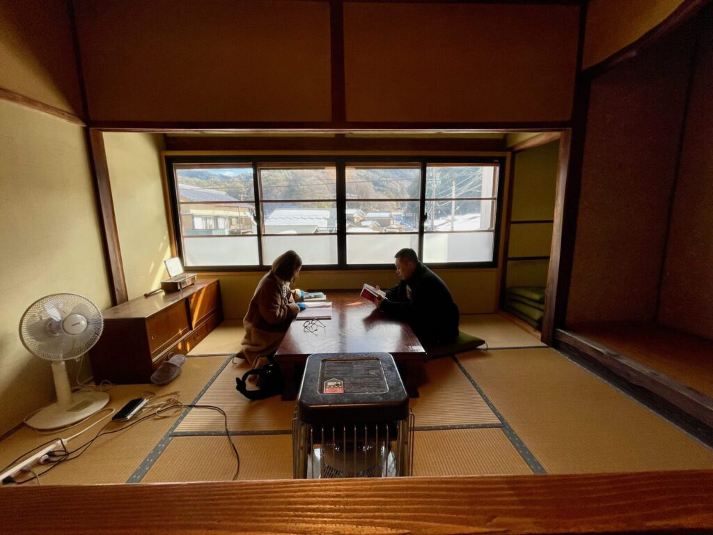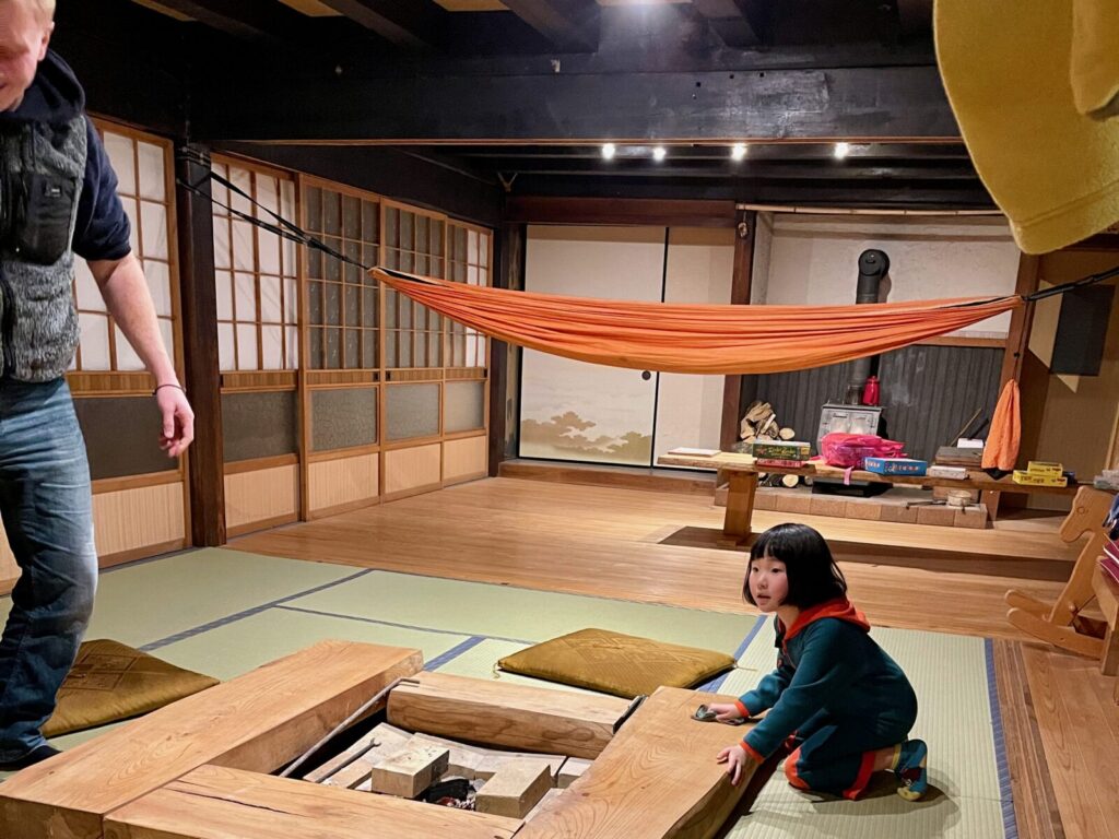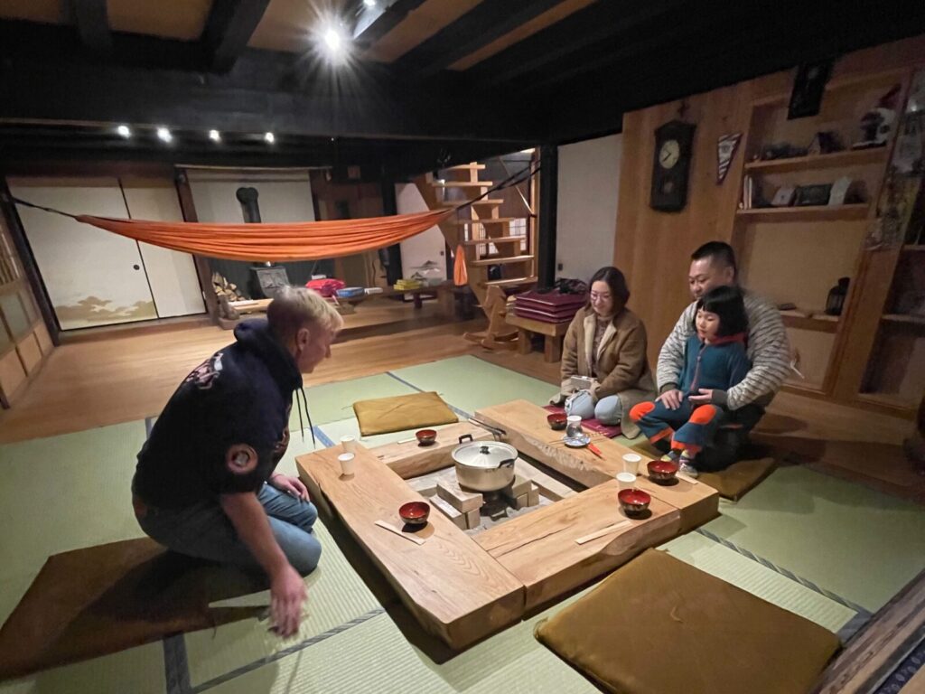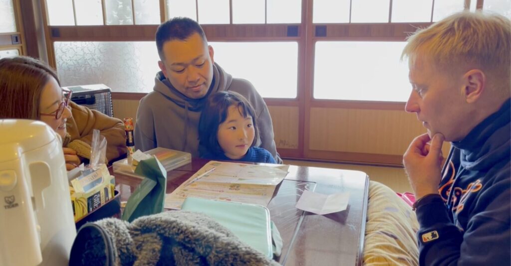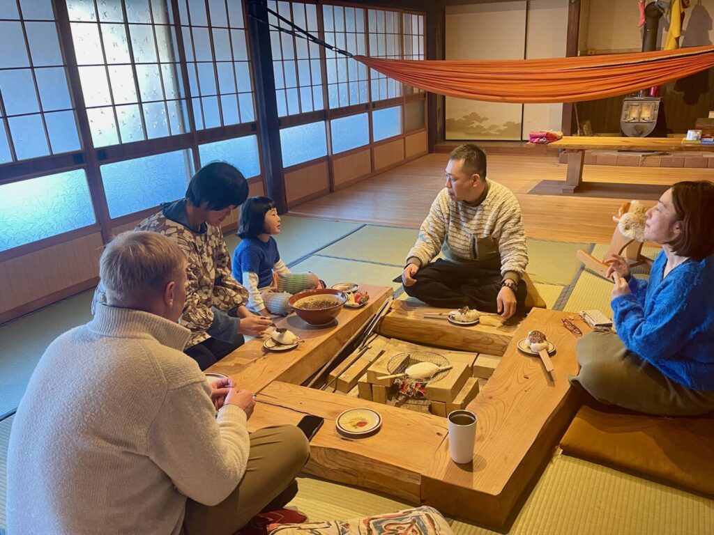 滞在の拠点は、築120年の古民家「うるぎ国際センター(UIC)」です。ホストのAlexさんと自然体験を楽しみながら英語も学べる「Alexの寺子屋」とも呼ばれています。到着早々、日本の冬ならではの「こたつ」を囲んで団らんが始まると、お母様を筆頭に自然と英語での会話がスタートしました。5ヶ国語を操るホストのAlexさんは、ご家族それぞれのレベルに合わせて優しく英語で対応してくれます。オンラインで英語に触れ始めているココちゃんはもちろん、「これを機に英語を学び始めたい」というお父様も含め、家族全員が楽しみながら英語環境に溶け込んでいく温かな幕開けとなりました。
