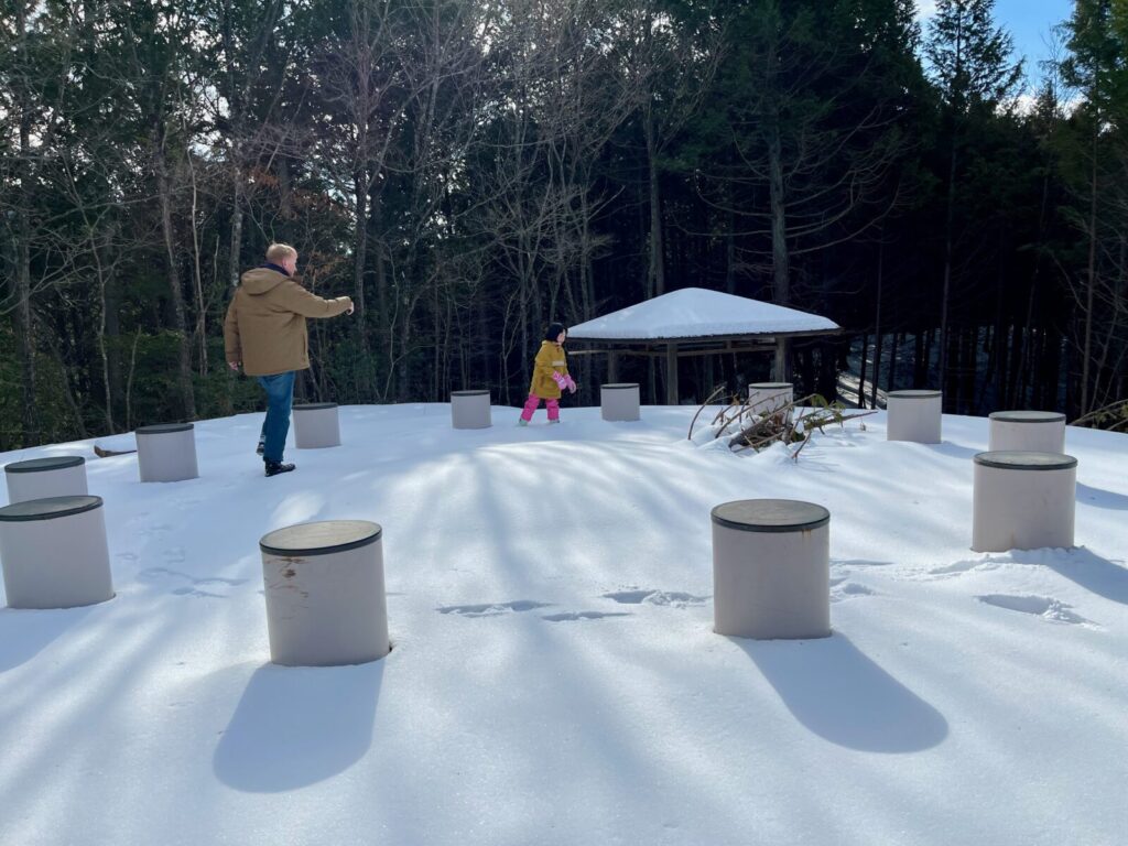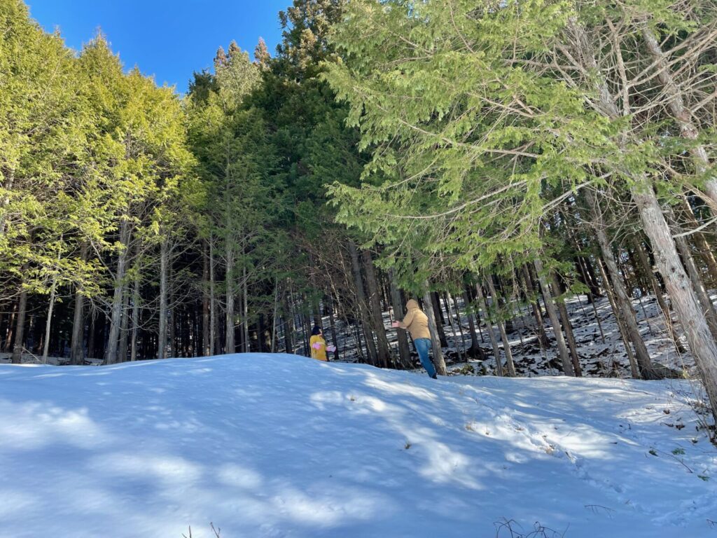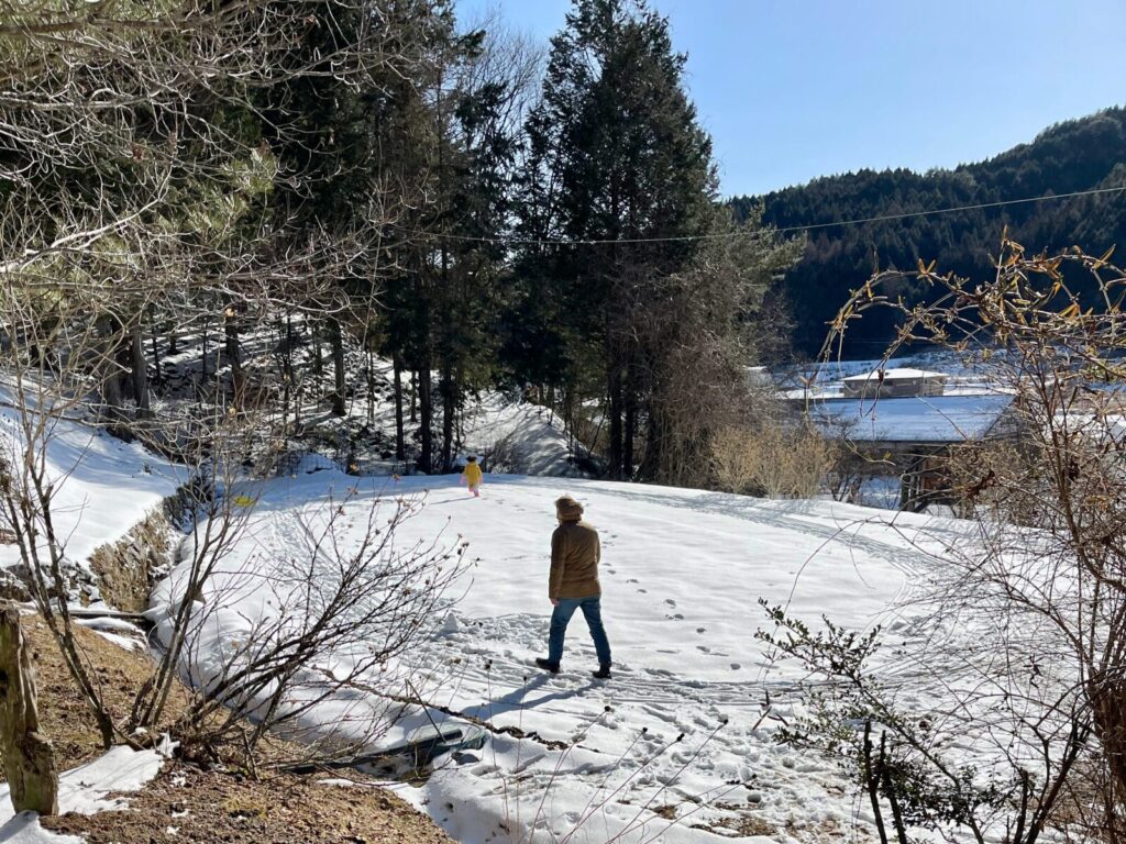 2日目のお昼には、予定していた飲食店が春まで冬季休業中というハプニングが発生!分刻みの都市生活ならイライラしてしまう場面かもしれませんが、ここでも売木村のコンパクトな利便性が活き、すぐ近くのお店へ予定を柔軟に変更することができました。さらに空いた時間を利用して、午前中にAlexさんと登った裏山へ、今度はココちゃん自らが「ガイド役」となってご両親を案内するという、「豊かな家族時間」に切り替わりました。