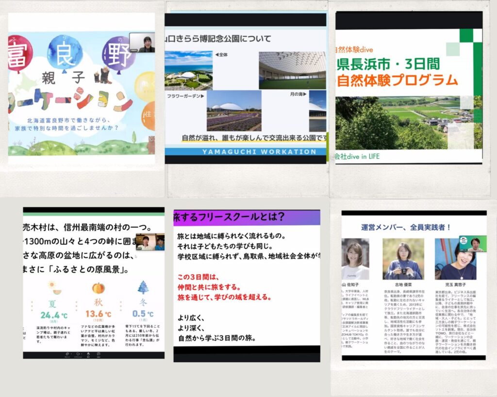 「地球の不思議を全身で感じ、大地のうえで、よく遊び、よく働く」「図鑑好きの子にも刺さる」をコンセプトにユネスコ世界ジオパークにも認定された特徴的な地形を活かした「お試し親子ワーケーションプラン2泊3日」のモデルプランや子どもは地元の小学校に通いながら、親はリモートワークする「体験入学」制度などを紹介。