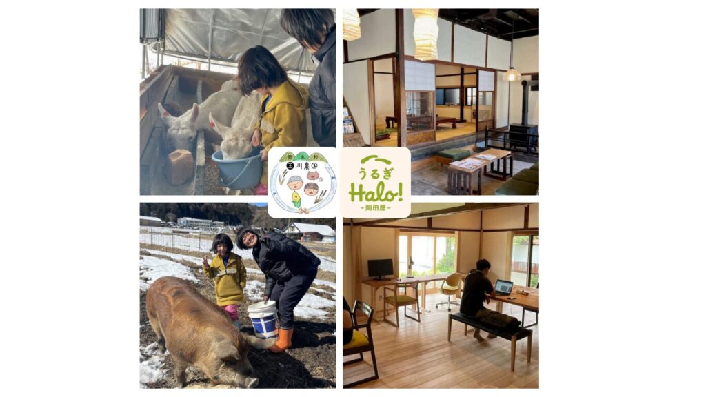 大正時代の旅館をリノベーションした拠点「うるぎHalo!-岡田屋-」には、集中できるワークスペースも完備(車で5分)。提携の「玉川農園」では、自給自足の知恵に触れる農業体験(オプション)も楽しめます(徒歩10分または車2分)。
