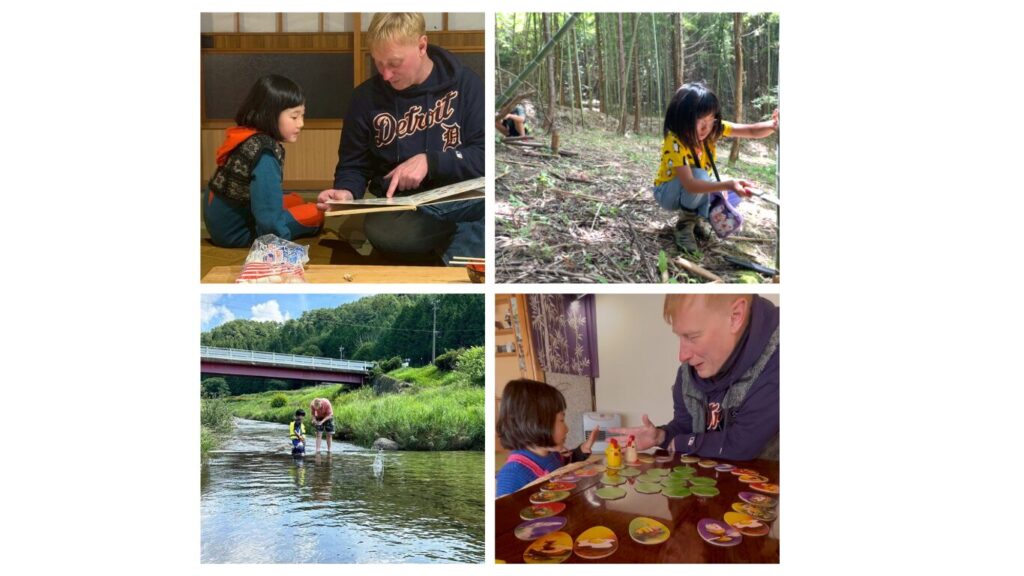 5ヶ国語を操るAlexさんの古民家を拠点に、生きた英語に触れる滞在を。夏は川遊びや竹細工、冬は雪遊びなどの自然体験から、ボードゲームや絵本タイムまでプライベートな楽しみが満載!